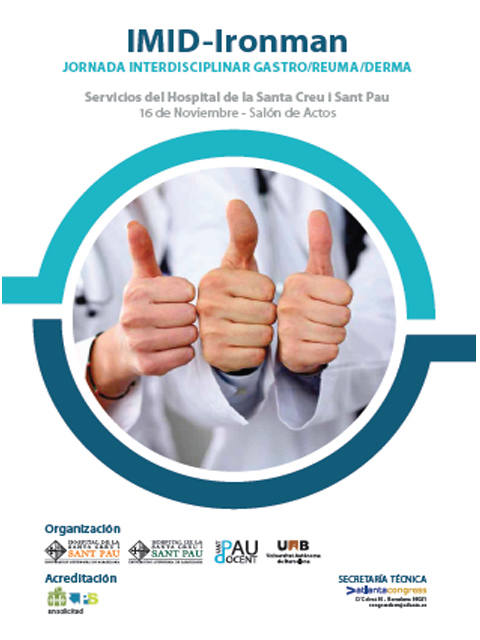 El proper 16 de novembre, a la sala d’actes de l’Hospital, tindrà lloc la jornada interdisciplinar Gastro/Reuma/Derma IMID-Ironman. L’objectiu d’aquesta jornada és presentar (sobre la base de casos clínics) i discutir de forma interactiva temes d’interès conjunt per als especialistes en el maneig de malalties inflamatòries immunomediades, sense separar-los en tallers per especialitats, donat que la col·laboració interdisciplinar és fonamental en determinades patologies com és el cas d’aquest tipus de malalties. Adjunt trobareu el programa de la jornada.