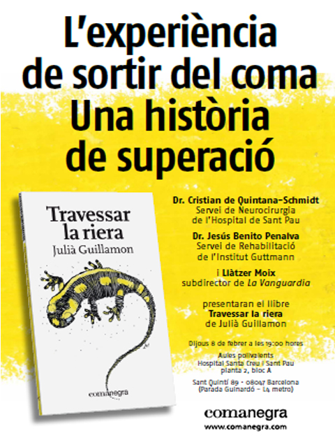 El proper dijous 8 de febrer es presentarà el llibre Travessar la riera, una obra escrita per l’investigador i columnista de La Vanguardia, Julià Guillamon. El llibre recull l’experiència de la Cris, de com va sortir del coma i de la seva rehabilitació, després d’un vessament cerebral. A la presentació hi seran els dos metges que l’han tractat: el Dr. Cristian de Quintana-Schmidt, del Servei de Neurocirurgia de l’Hospital de Sant Pau, qui la va operar, i el Dr. Jesús Benito Penalva, del Servei de Rehabilitació de l’Institut Guttmann, qui dirigeix el procés de rehabilitació. La cita és a les 19h, a les aules polivalents de l’Hospital.