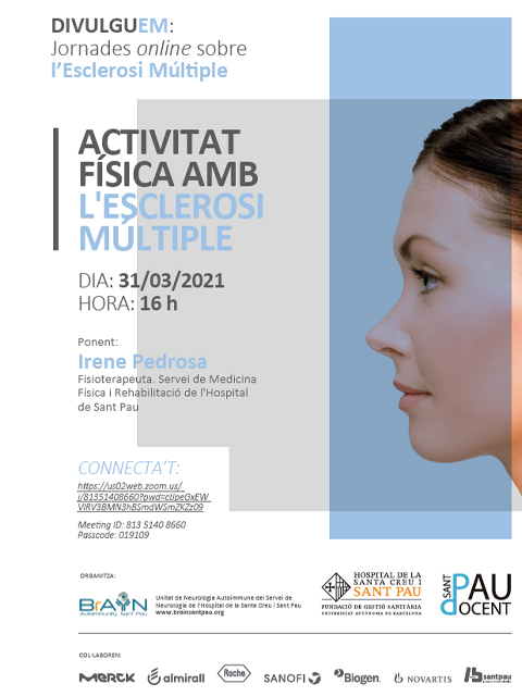 El proper 31 de març, a les 16 hores, tindrà lloc la xerrada divulgativa per a pacients “Activitat física amb l’esclerosi múltiple” a càrrec d’Irene Pedrosa, fisioterapeuta del Servei de Medicina Física i Rehabilitació. Una sessió online, organitzada per la Unitat Neurologia Autoimmune, del Servei de Neurologia de Sant Pau.