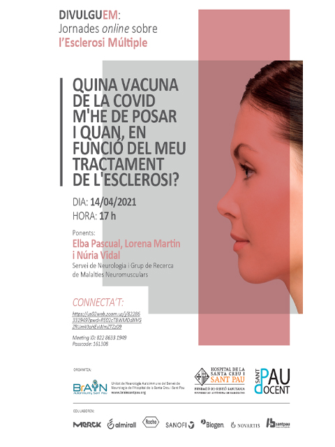 El proper 14 d’abril, a les 17 hores, tindrà lloc la xerrada divulgativa per a pacients “Quina vacuna de la Covid m’he de posar i quan, en funció del meu tractament d’esclerosi múltiple” a càrrec d’Elba Pascual, Lorena Martin i Núria Vidal, del Servei de Neurologia i del Grup de Recerca de Malalties Neuromusculars. Una sessió online, organitzada per la Unitat Neurologia Autoimmune, del Servei de Neurologia de Sant Pau.