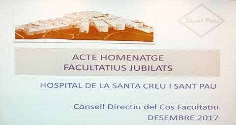 Avui, dimarts 19 de desembre, ha tingut lloc a la Sala d'Actes de l'Hospital l'acte de reconeixement als metges jubilats durant el 2017. L'acte ha estat organitzat pel Consell Directiu del Cos Facultatiu i ha comptat amb una interpretació musical a càrrec de la Coral del Col·legi Oficial de Metges de Barcelona i l'Hospital de Sant Pau.