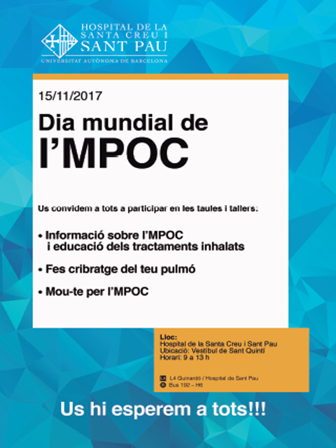El proper 15 de novembre, coincidint amb el Dia Mundial de l’MPOC (Malaltia Pulmonar Obstructiva Crònica), el Servei de Pneumologia de Sant Pau ha organitzat una sèrie de taules i tallers, al vestíbul de l’Hospital. L’objectiu és difondre i conscienciar d’aquesta patologia tan prevalent i alhora tan fàcil de prevenir, simplement evitant l’hàbit de fumar.