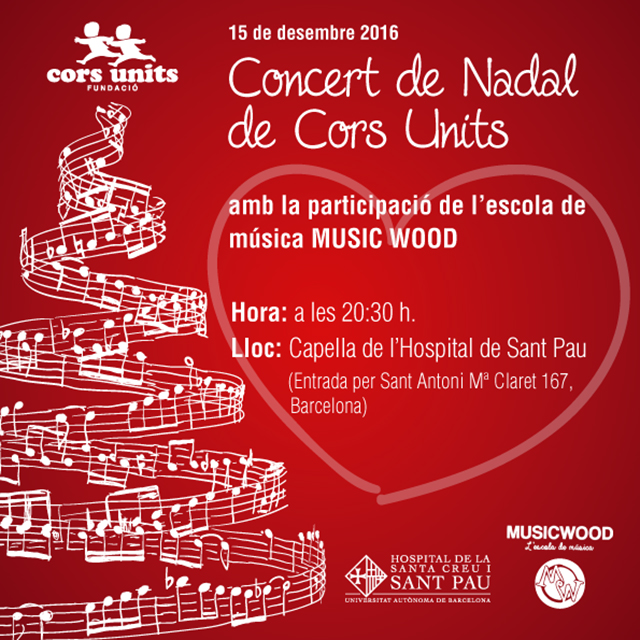 El proper 15 de desembre, a les 20.30 h., se celebrarà el Concert de Nadal de Cors Units amb la participació de l’escola de música Music Wood. L’acte tindrà lloc a l’Església de l’Hospital de la Santa Creu i Sant Pau.