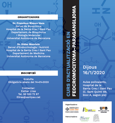 Els Serveis de Bioquímica i d'Endocrinologia i Nutrició de Sant Pau organitzen un Curs d'Actualització en Feocromocitoma-Paraganglioma la tarda del 16 de gener de 2020 a les sales polivalents. Trobareu més informació, incloent la relativa a les inscripcions, en el tríptic adjunt.