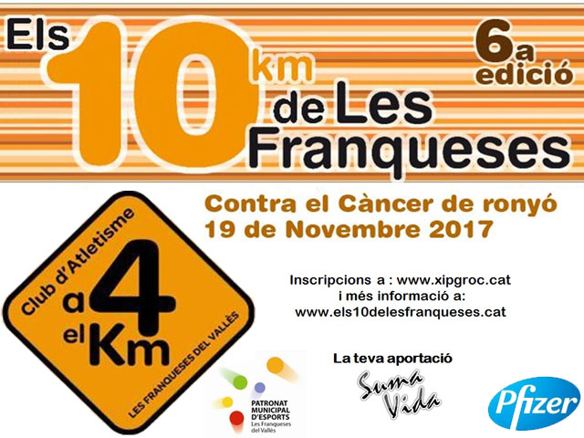 El diumenge 19 de novembre tindrà lloc a Les Franqueses del Vallès la 6ena. edició de la cursa “Els 10 kilòmetres de Les Franqueses” amb la col·laboració de l'Ajuntament d'aquesta localitat i l'aval de la Federació Catalana d'Atletisme. La recaptació de totes les edicions de la cursa es destina al Grup de Recerca Clínica en Oncologia de l’IIB, que lidera el Dr. Agustí Barnadas, específicament en la línia d’investigació del càncer de ronyó, de la qual el Dr. Pablo Maroto n’és el responsable.