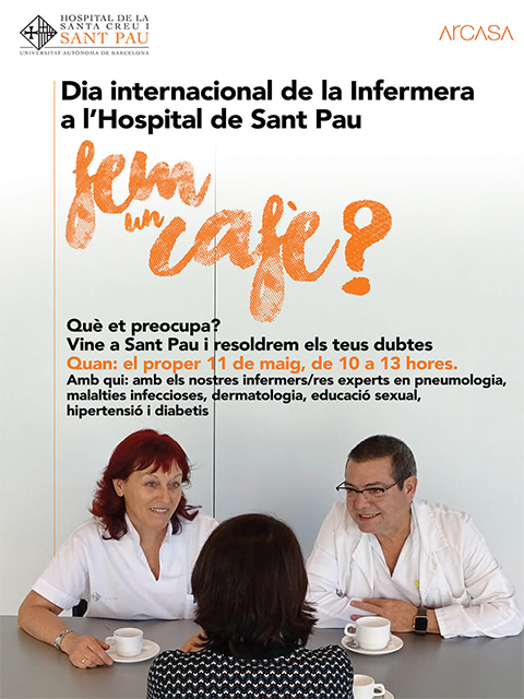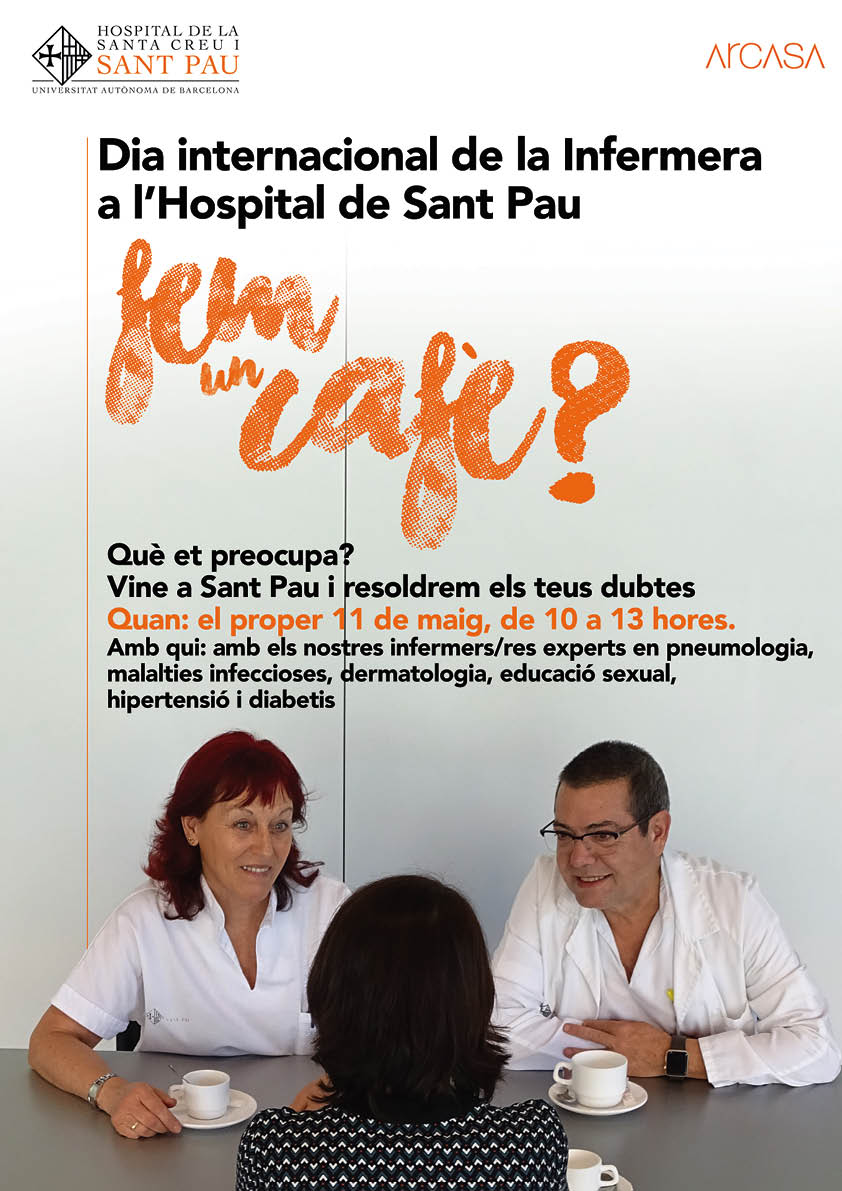 El proper 11 de maig, de 10 a 13 hores, les infermeres i els infermers de Sant Pau experts en pneumologia, malalties infeccioses, dermatologia, educació sexual, hipertensió i diabetis et convidem a un cafè al vestíbul de l’Hospital. Vine a passar una estona amb ells i respondran tots els teus dubtes sobre les seves especialitats.