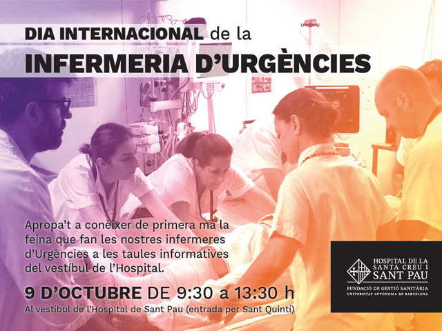 Demà, 9 d’octubre, podràs conèixer de primera mà la feina que fan les nostres infermeres d’Urgències. Durant tot el matí al vestíbul de l’Hospital de Sant Pau hi haurà taules informatives on t’informaran de com realitzar els primers auxilis, cures urgents i com treballen els professionals d’infermeria dins del Servei d’Urgències de Sant Pau.