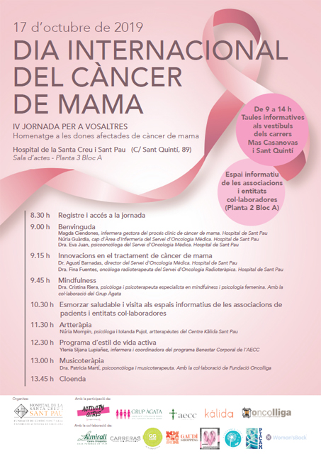 Sant Pau se suma a les activitats del Dia Mundial del Càncer de Mama i el proper 17 d’octubre ha organitzat, 9 a 14 hores, la “IV Jornada per a vosaltres: un homenatge a les dones afectades per aquesta malaltia”, amb una sèrie d’activitats a la sala d’actes de l’Hospital: conferències i tallers de mindfulness, musicoteràpia i artteràpia. També hi haurà un espai informatiu per a les associacions de pacients i entitats col·laboradores, i com sempre, dos punts informatius als vestíbuls dels carrers Mas Casanovas i Sant Quintí.