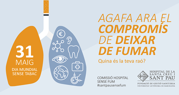 Sant Pau se suma a les iniciatives del 31 de maig, Dia Mundial Sense Tabac, amb el lema “Agafa ara el compromís de deixar de fumar”. L’Hospital organitzarà diverses activitats a les xarxes per tal de conscienciar sobre la importància de deixar de fumar. Aprofita el #DiaMundialSenseTabac i agafa ara el compromís de deixar de fumar! A #SantPau t’ajudem!