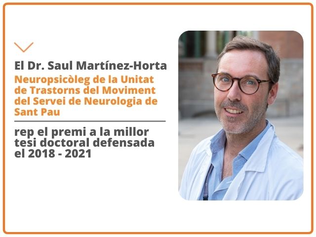 El Dr. Saul Martinez-Horta, neuropsicòleg de la Unitat de Trastorns del Moviment del Servei de Neurologia, ha estat guardonat amb la millor tesi doctoral presentada durant el 2018 – 2021 en el marc de l’edició dels Premis PhD del Col·legi Oficial de la Psicologia de Catalunya. La tesi guanyadora va ser dirigida pel Dr. Jaume Kulisevsky i Javier Pagonabarraga, portant com a títol “Correlatos neuronales y neuropsicológicos de las alteraciones cognitivas y conductuales en las fases prodrómica e inicial de la enfermedad de Huntington”.