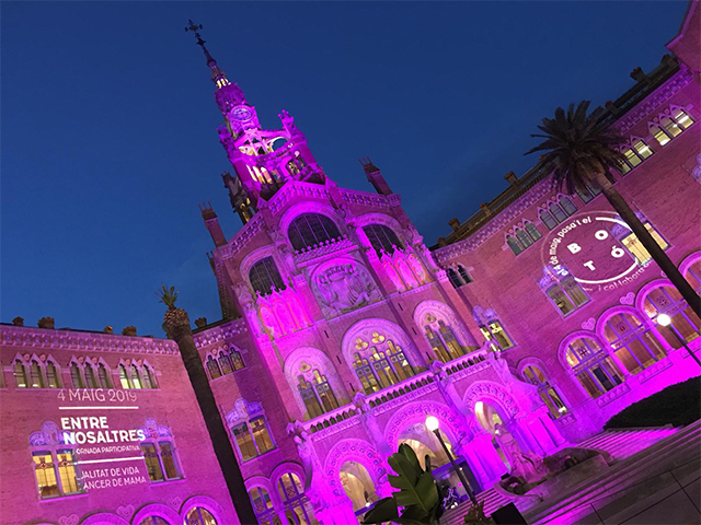 La façana principal del Recinte Modernista de Sant Pau es va tenyir ahir al vespre de rosa amb motiu de la 3a Jornada participativa de qualitat de vida i càncer de mama Entre Nosaltres 2019. Avui, de 20 a 24 hores, es tornarà a il·luminar com a preàmbul de la Jornada de demà.