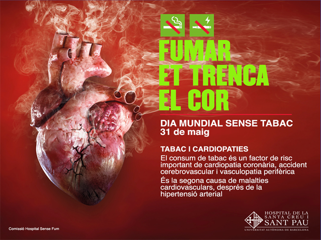 Sant Pau se suma a les iniciatives del Dia Mundial Sense Tabac amb el lema “Fumar et trenca el cor” previstes pel proper 31 de maig. L’Hospital organitza diferents activitats a diversos espais del recinte i enguany l’EUI-Sant Pau s’uneix a la celebració muntant diversos punts informatius.