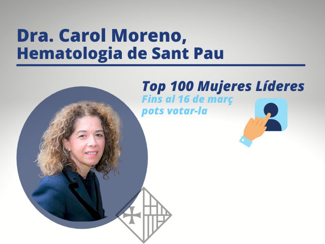 Dra. Carol Moreno, metgessa del Servei d’Hematologia de Sant Pau ha estat escollida com una de les candidates a les “Top 100 Mujeres Líderes en España”, dins l’apartat d’Acadèmiques, Investigadores i Pensadores. Podeu votar per ella fins el proper 16 de març en el següent enllaç (https://lastop100.com/profile/carol.moreno/)