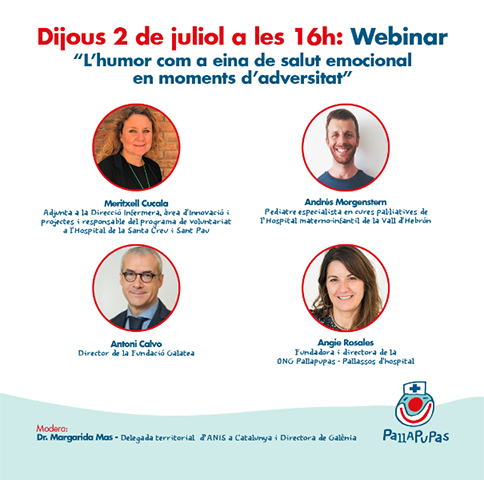 Meritxell Cucala, adjunta a la Direcció Infermera participarà, el proper 2 de juliol a les 16 hores, en el webinar “L’humor com a eina de salut emocional en moments d’adversitat” organitzat per Pallapupas; una reflexió sobre la visió global de la societat vers l’humor com a canvi de paradigma.