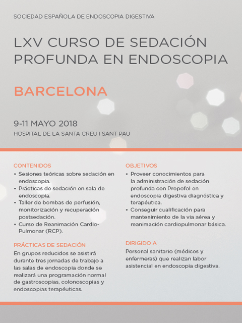 Del 9 a l’11 de maig tindrà lloc a Sant Pau “LXV Curs de sedació profunda en endoscòpia” a les aules de formació de l’Hospital (4a i 5a planta). L’objectiu del curs és que els professionals assistencials de les Unitats d'endoscòpia digestiva adquireixin els coneixements necessaris per a l’administració de sedació profunda amb Propofol i la qualificació pel manteniment de la via aèria i la reanimació cardiopulmonar bàsica.
