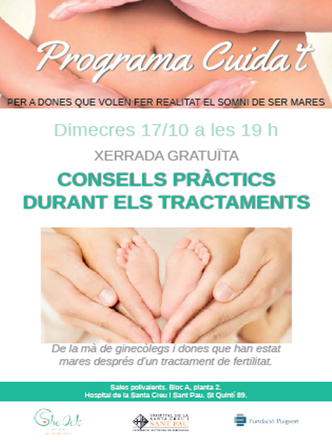 Segona xerrada del Programa Cuida’t. De la ma de ginecòlegs i amb el testimoni de dones que han estat mares després d’un tractament de fertilitat, She Oak en col·laboració amb l’Hospital de Sant Pau i la Fundació Puigvert ofereixen en aquesta segona xerrada “consells pràctics durant els tractaments”. La cita és el proper 17 d’octubre a les 19 hores a les sales polivalents de l’Hospital. L’entrada és lliure i gratuïta.