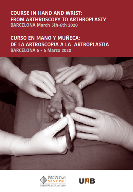 Els propers 5 i 6 de març tindrà lloc a la sala d’actes de l’Hospital el curs “Course in Hand and Wrist: from arthroscopy to arthroplasty”, dirigit per la Dra. Claudia Lamas Gómez, de la Unitat de Cirurgia de la Mà i de l'Extremitat Superior, del Servei de Cirurgia Ortopèdica i Traumatologia de Sant Pau amb destacats ponents nacionals i internacionals. Adjunt trobareu el programa de la jornada.