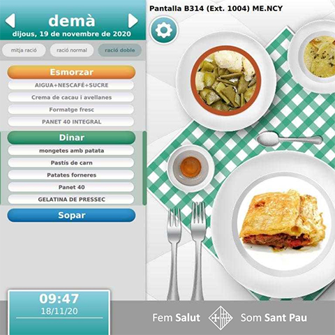 Els pacients ingressats a les sales d’Hospitalització de Sant Pau podran escollir els seus menús a través dels braços articulats que tenen a les seves habitacions. Aquesta iniciativa del Servei de Dietètica i Alimentació de l’Hospital, amb la col·laboració del Servei d’Informàtica, Arcasa i Tecatel, va iniciar-se a començaments de febrer a les àrees d’Hematologia i Hospitalització Covid i s’anirà successivament implantant a la resta de l’Hospital. Un projecte pioner que vol maximitzar la satisfacció alimentària adaptant-se als hàbits dels pacients, al mateix temps que minimitza el malbaratament alimentari i alleugereix la càrrega assistencial de passar el menú d’elecció en format paper.