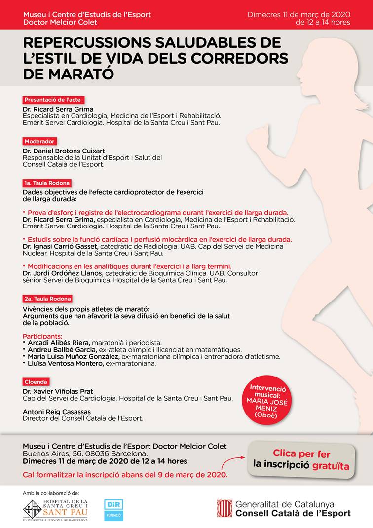 El proper dimecres 11 de març, al Museu i Centre d’Estudis de l’Esport Doctor Melcior Colet, tindrà lloc la jornada “Repercussions saludables de l’estil de vida dels corredors de marató”. Un acte presentat pel Dr. Ricard Serra Grima, emèrit del Servei de Cardiologia de Sant Pau. Participaran també en la jornada diferents professionals de l’Hospital com el Dr. Ignasi Carrió, director del Servei de Medicina Nuclear, el Dr. Jordi Ordóñez, consultor sènior del Servei de Bioquímica i el Dr. Xavier Viñolas, director del Servei de Cardiologia. Adjunt trobareu el programa.
