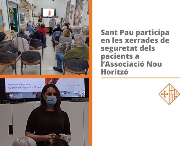 Mar Pina, Infermera del Programa de Seguretat Clínica i membre de la Comissió de Seguretat del Pacient, va participar recentment en una xerrada en l'Associació Nou Horitzó dins del marc d'activitats de seguretat dels pacients en les quals participa l'Hospital i que s'adrecen a la població amb l'objectiu de potenciar la formació i la difusió de la cultura de seguretat entre els pacients, familiars i cuidadors.
