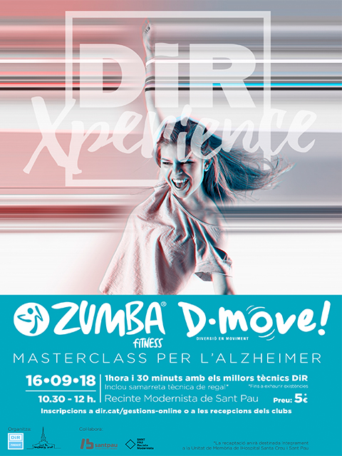 Ja et pots inscriure a la Masterclass de Zumba D-Move per a la lluita contra l’Alzheimer. Com l’any passat la Unitat de Memòria de Sant Pau i la Fundació Dir uneixen esforços i et proposen gaudir d’una trobada esportiva i festiva al Recinte Modernista de Sant Pau. La cita, el proper 16 de setembre de 10.30 a 12 hores.