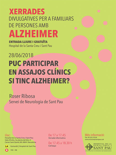 El proper 28 de juny se celebrarà la sessió del Cicle de Xerrades divulgatives per a familiars de persones amb Alzheimer: “Puc participar en assajos clínics si tinc Alzheimer?”, a càrrec de Roser Ribosa, del Servei de Neurologia de Sant Pau. La cita és a les 17 hores a la sala d’actes de l’Hospital. L’entrada és lliure i gratuïta.